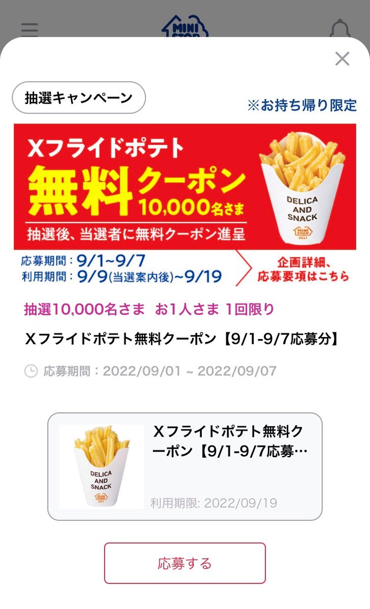 【9月1日まで】【ミニストップ公式】1,000名!石垣島紅芋ソフト無料券がプレゼント中! ミニストップ公式にて、石垣島紅芋ソフト無料券がプレゼント中です。 【応募詳細】 ミニストップ公式アカウントをフォローし、キャンペーンツイートをリツイート後、応募すると、石垣島紅芋ソフト無料券がキャンペーン期間中抽選で1,000名さまに当たる! 2022年08月28日 (日) 18:37 カテゴリ:クーポン・プレゼント
